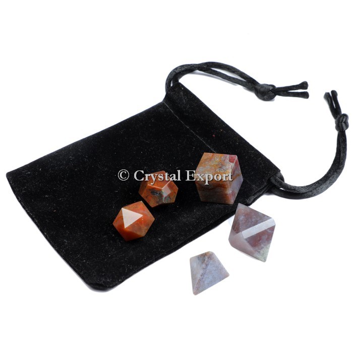Shop online for Fancy Jasper Geometry Set With Velvet Pouch at low pricees. Fancy Jasper is a stone of tranquility. Jasper itself is a great stone for balancing the chakras and fancy jasper is particularly good for those since it has so many colors within it. It helps to promote vitality and perseverance, and is excellent for those recovering from illness. It also helps to detox the body, since it has so many different jaspers within it. Place the order for Fancy Jasper Geometry Set With Velvet Pouch.