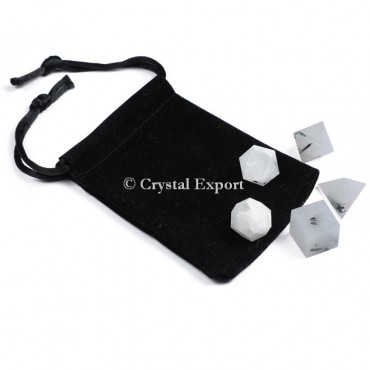Shop online for White Rutile Geometry Set With Velvet Pouch. White Quartz has the meaning and properties to purify negative energy. It is a gemstone not to accumulate negative thoughts and emotions. It is also recommended when you need spiritual healing. It will help to keep good condition. Rutilated Quartz can clear energy blockages from all of the chakras, and attune one to their Divine Purpose. Rutilated Quartz puts off an exceptionally high level of energy, and is said to bring physical and mental balance and stability. Rutilated Quartz also enhances self-reliance and helps with decision-making. Order online now.